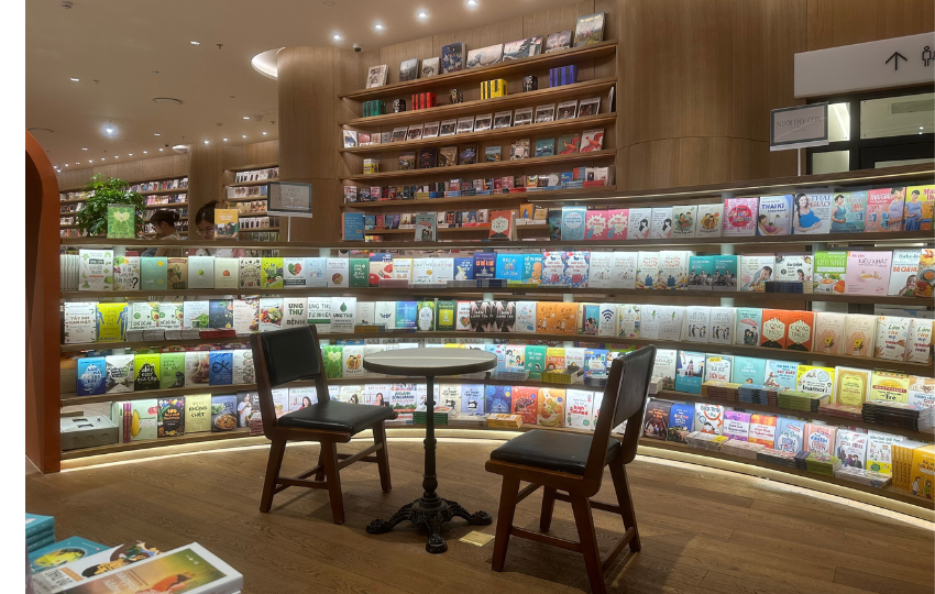 Toàn bộ nội thất sử dụng bằng vật liệu cũng như phong cách hiện đại, không vách ngăn, tạo cảm giác liền mạch, xuyên suốt mà vẫn chắc chắn, sáng sủa và tôn vinh vẻ đẹp của sách. Nội thất giá kệ kết hợp với không gian tiếp cận hiệu sách được mở tối đa nhằm thúc đẩy một tinh thần cởi mở và chia sẻ của một Hiệu sách – Đô thị hiện đại.