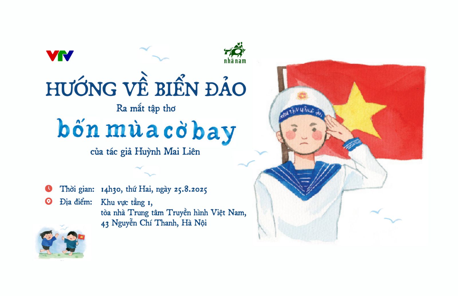 Vào lúc 14h30, thứ Hai ngày 25 tháng 8 năm 2025, tại Tòa nhà Trung tâm Truyền hình Việt Nam, số 43 Nguyễn Chí Thanh, Hà Nội, Nhã Nam phối hợp cùng Đài Truyền hình Việt Nam tổ chức buổi ra mắt tập thơ “Bốn mùa cờ bay” của tác giả Huỳnh Mai Liên.